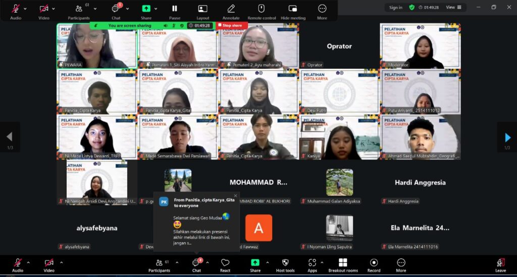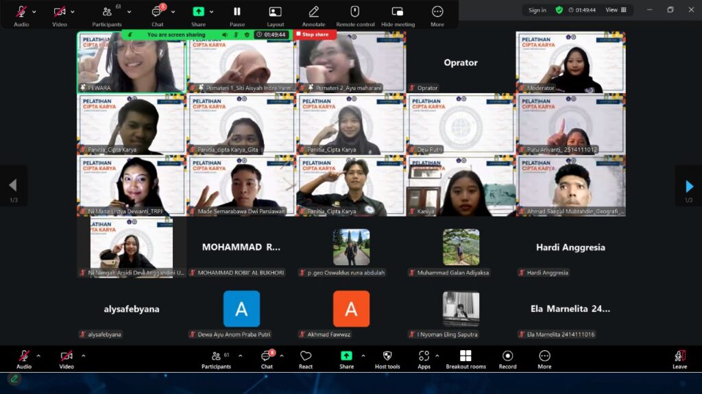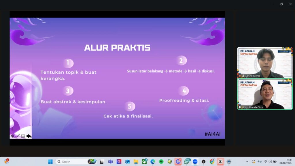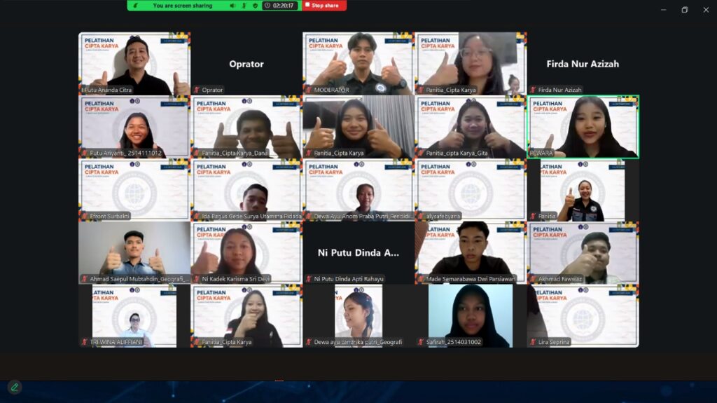 Pelatihan Cipta Karya Ilmiah dilaksanakan pada Sabtu, 4 Oktober 2025, pukul 09.00 WITA dengan Pemateri Bapak Dr. I Putu Ananda Citra, S.Pd., M.Sc., dosen Jurusan Geografi, yang menyampaikan materi mengenai Pelatihan Penulisan Artikel Ilmiah Dengan Artifial Intelligence (Ai) “Dari Ide Hingga Publikasi: Memanfaatkan Ai Secara Etis” Sementara itu, Pelatihan Cipta Karya Non Ilmiah dilaksanakan pada Minggu, 5 Oktober 2025, pukul 13.00 WITA dengan 2 Pemateri oleh Ni Putu Ayu Maharani Putri dari Program Studi Pendidikan Geografi serta Kak Siti Aisyah Indra Yarman dari Program Studi Teknologi Rekayasa Perencanaan Jauh (TRPJ). Keduanya merupakan mahasiswa Jurusan Geografi yang berpengalaman dalam pengembangan karya kreatif seperti Pentigraf,desain poster, infografis, dan media grafis non ilmiah lainnya.