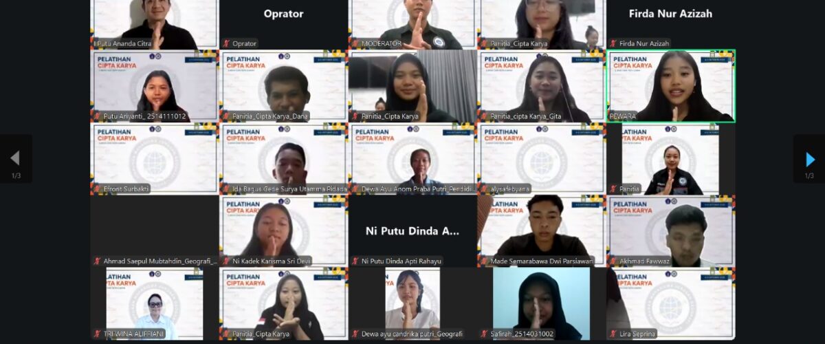 Pada hari Sabtu dan Minggu, tanggal 4–5 Oktober 2025, telah dilaksanakan kegiatan Pelatihan Cipta Karya 2025 yang diselenggarakan oleh Himpunan Mahasiswa Jurusan Geografi, Fakultas Hukum dan Ilmu Sosial, Universitas Pendidikan Ganesha. Kegiatan ini dilaksanakan secara daring melalui Zoom Meeting.